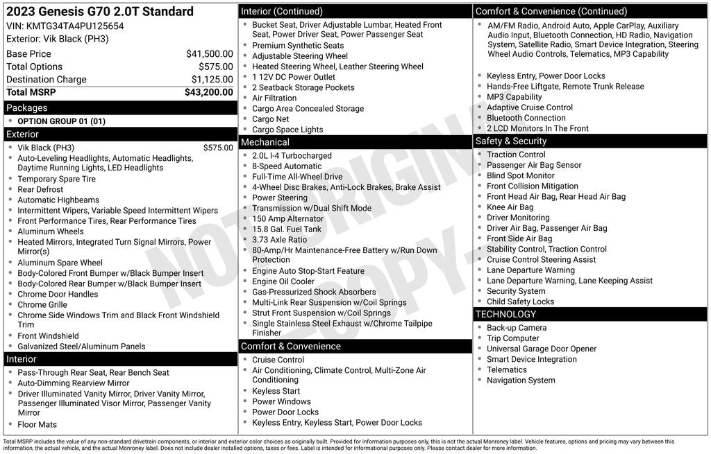 Option Group 01, 4-Wheel Disc Brakes, 6 Speakers, ABS brakes, Air Conditioning, Alloy wheels, AM/FM radio: SiriusXM, Android Auto & Apple CarPlay, Anti-whiplash front head restraints, Auto High-beam Headlights, Auto-dimming Rear-View mirror, Automatic temperature control, Brake assist, Bumpers: body-color, Delay-off headlights, Driver door bin, Driver vanity mirror, Dual front impact airbags, Dual front side impact airbags, Electronic Stability Control, Emergency communication system: Genesis Connected Services, Exterior Parking Camera Rear, Four wheel independent suspension, Front anti-roll bar, Front Bucket Seats, Front Center Armrest, Front dual zone A/C, Front reading lights, Fully automatic headlights, Garage door transmitter: HomeLink, Heated door mirrors, Heated front seats, Heated Multi-Adjustable Front Bucket Seats, Heated steering wheel, Illuminated entry, Knee airbag, Leatherette Seating Surfaces, Low tire pressure warning, Navigation System, Occupant sensing airbag, Outside temperature display, Overhead airbag, Overhead console, Panic alarm, Passenger door bin, Passenger vanity mirror, Power door mirrors, Power driver seat, Power passenger seat, Power steering, Power windows, Radio: AM/FM/SiriusXM/HD Audio System, Rear anti-roll bar, Rear reading lights, Rear seat center armrest, Rear window defroster, Remote keyless entry, Security system, Speed control, Speed-Sensitive Wipers, Split folding rear seat, Steering wheel mounted audio controls, Tachometer, Telescoping steering wheel, Traction control, Trip computer, Turn signal indicator mirrors, Variably intermittent wipers, and Wheels: 19" x 8.0J Fr & 19" x 8.5J Rr Alloy.