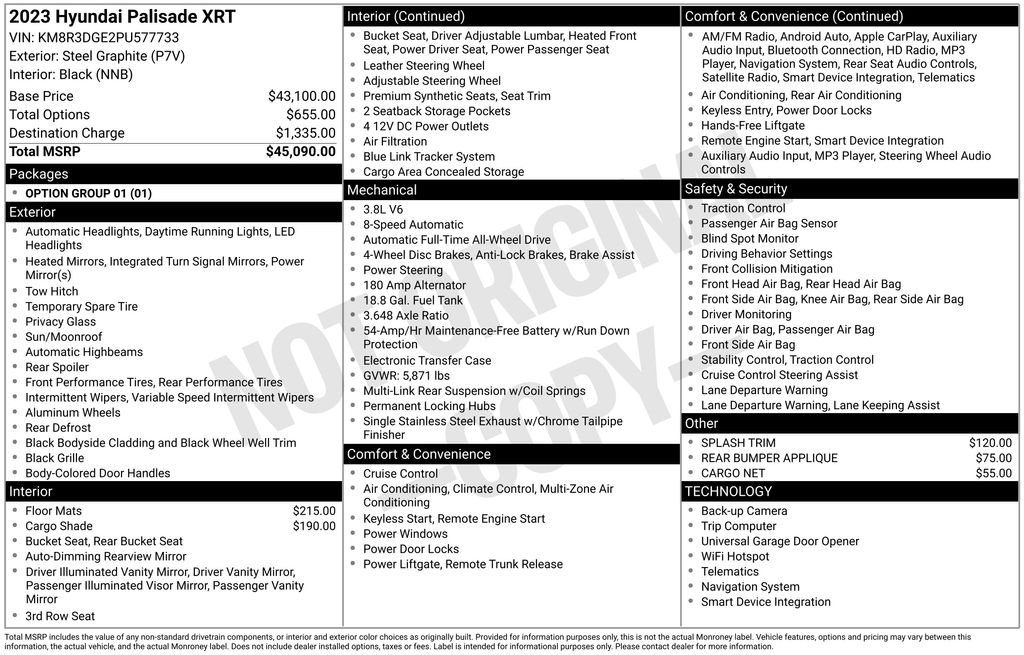 Option Group 01, 3.648 Axle Ratio, 3rd row seats: split-bench, 4-Wheel Disc Brakes, 6 Speakers, ABS brakes, Air Conditioning, Alloy wheels, AM/FM radio: SiriusXM, Apple CarPlay & Android Auto, Auto High-beam Headlights, Auto-dimming door mirrors, Auto-dimming Rear-View mirror, Auto-leveling suspension, Automatic temperature control, Brake assist, Bumpers: body-color, Cargo Cover/Screen, Cargo Net, Carpeted Floor Mats, Delay-off headlights, Driver door bin, Driver vanity mirror, Dual front impact airbags, Dual front side impact airbags, Electronic Stability Control, Emergency communication system: Blue Link Connected Car Service (3-year complimentary subscription), Exterior Parking Camera Rear, Four wheel independent suspension, Front anti-roll bar, Front Bucket Seats, Front Center Armrest, Front dual zone A/C, Front reading lights, Fully automatic headlights, Garage door transmitter: HomeLink, H-Tex Leatherette Seat Trim, Heated door mirrors, Heated Front Bucket Seats, Heated front seats, Illuminated entry, Knee airbag, Low tire pressure warning, Navigation System, Occupant sensing airbag, Outside temperature display, Overhead airbag, Overhead console, Panic alarm, Passenger door bin, Passenger vanity mirror, Power door mirrors, Power driver seat, Power Liftgate, Power moonroof, Power passenger seat, Power steering, Power windows, Radio data system, Radio: AM/FM/MP3 Audio System, Rear air conditioning, Rear anti-roll bar, Rear audio controls, Rear Bumper Applique, Rear reading lights, Rear side impact airbag, Rear window defroster, Rear window wiper, Reclining 3rd row seat, Remote keyless entry, Security system, Speed control, Speed-sensing steering, Splash Trim, Split folding rear seat, Spoiler, Steering wheel mounted audio controls, Tachometer, Telescoping steering wheel, Tilt steering wheel, Traction control, Trip computer, Turn signal indicator mirrors, Variably intermittent wipers, and Wheels: 20" x 7.5J Dark Alloy w/Rugged Styling.