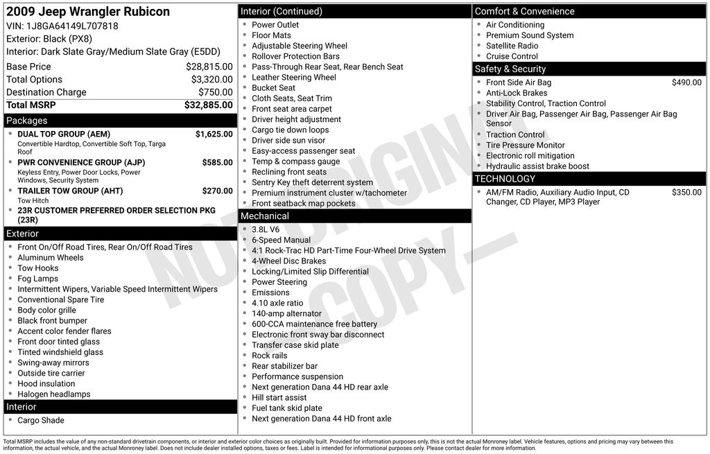 Dual Top Group (Freedom Panel Storage Bag, Rear Window Defroster, and Rear Window Wiper/Washer), Power Convenience Group (Power Locks, Power Windows w/Driver & Front Passenger 1-Touch, Remote Keyless Entry, and Security Alarm), Quick Order Package 23R, Trailer Tow Group (Class II Receiver Hitch, Trailer Sway Damping, and Trailer Tow w/4-Pin Connector Wiring), 4WD, 17" x 7.5" Machined Cast Aluminum Wheels, 4-Wheel Disc Brakes, 4.10 Axle Ratio, 7 Speakers, ABS brakes, Air Conditioning, Alloy wheels, AM/FM 6 Disc DVD MP3, AM/FM CD/MP3 Radio, AM/FM radio: SIRIUS, BF Goodrich Brand Tires, Brake assist, CD player, Compass, Driver door bin, Driver Height Adjuster Seat, Dual front impact airbags, Electronic Stability Control, Front anti-roll bar, Front Bucket Seats, Front Center Armrest, Front fog lights, Front Seat Back Map Pockets, Integrated roll-over protection, Leather steering wheel, Low tire pressure warning, Occupant sensing airbag, Outside temperature display, Passenger door bin, Performance Suspension, Power steering, Premium Cloth Low-Back Bucket Seats, Radio data system, Rear anti-roll bar, SIRIUS Satellite Radio, Speed control, Stain Repel Seat Fabric, Supplemental Front Seat Side Airbags, Tachometer, Tilt steering wheel, Traction control, Trip computer, and Variably intermittent wipers.