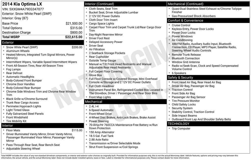 Snow White Pearl 2014 Kia Optima LX FWD 6-Speed Automatic with Sportmatic 2.4L I4 DGI DOHC 23/34 City/Highway MPG