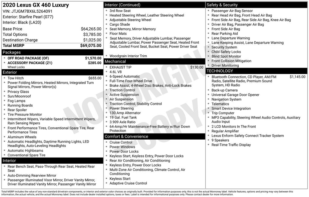 19" x 7.5J Aluminum Alloy Wheels, 3.909 Axle Ratio, 3rd row seats: split-bench, 4-Wheel Disc Brakes, 9 Speakers, ABS brakes, Adaptive suspension, Air Conditioning, Alloy wheels, AM/FM radio: SiriusXM, Anti-whiplash front head restraints, Auto High-beam Headlights, Auto tilt-away steering wheel, Auto-dimming door mirrors, Auto-dimming Rear-View mirror, Auto-leveling suspension, Automatic temperature control, Bodyside moldings, Brake assist, Bumpers: body-color, CD player, Compass, Delay-off headlights, Driver door bin, Driver vanity mirror, Driver's Seat Mounted Armrest, Dual front impact airbags, Dual front side impact airbags, Electronic Stability Control, Emergency communication system, Exterior Parking Camera Rear, Front anti-roll bar, Front Bucket Seats, Front dual zone A/C, Front fog lights, Front reading lights, Front wheel independent suspension, Fully automatic headlights, Garage door transmitter: HomeLink, Genuine wood console insert, Genuine wood dashboard insert, Genuine wood door panel insert, Headlight cleaning, Heated & Ventilated Front Bucket Seats, Heated door mirrors, Heated front seats, Heated rear seats, Heated steering wheel, Illuminated entry, Illuminated running boards, Knee airbag, Leather Shift Knob, Leather steering wheel, Low tire pressure warning, Memory seat, Navigation System, Occupant sensing airbag, Outside temperature display, Overhead airbag, Overhead console, Panic alarm, Passenger door bin, Passenger seat mounted armrest, Passenger vanity mirror, Power door mirrors, Power driver seat, Power moonroof, Power passenger seat, Power steering, Power windows, Radio data system, Radio: AM/FM Lexus Multimedia System, Rain sensing wipers, Rear air conditioning, Rear anti-roll bar, Rear reading lights, Rear seat center armrest, Rear side impact airbag, Rear window defroster, Rear window wiper, Remote keyless entry, Roof rack: rails only, Security system, Semi-Aniline Leather Seat Trim, Speed control, Speed-sensing steering, Split folding rear seat, Spoiler, Steering wheel memory, Steering wheel mounted audio controls, Tachometer, Telescoping steering wheel, Tilt steering wheel, Traction control, Trip computer, Turn signal indicator mirrors, Variably intermittent wipers, and Ventilated front seats.